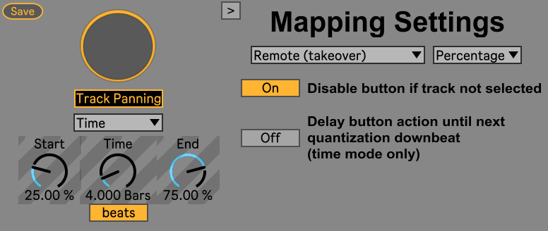 This device has a save button. This device changes unit styles, parameter ranges, and other properties dynamically based on how a user wants to control a mapped parameter, and while parameter values are saved within a live set, parameter ranges and unit styles that are changed dynamically are NOT saved with a live set. This means that all these parameter attributes have to be saved via presets and dynamically recalled when live reopens. The preset saving happens automatically in the background every minute, every time you change the mapped parameter, and every time you hit the button.